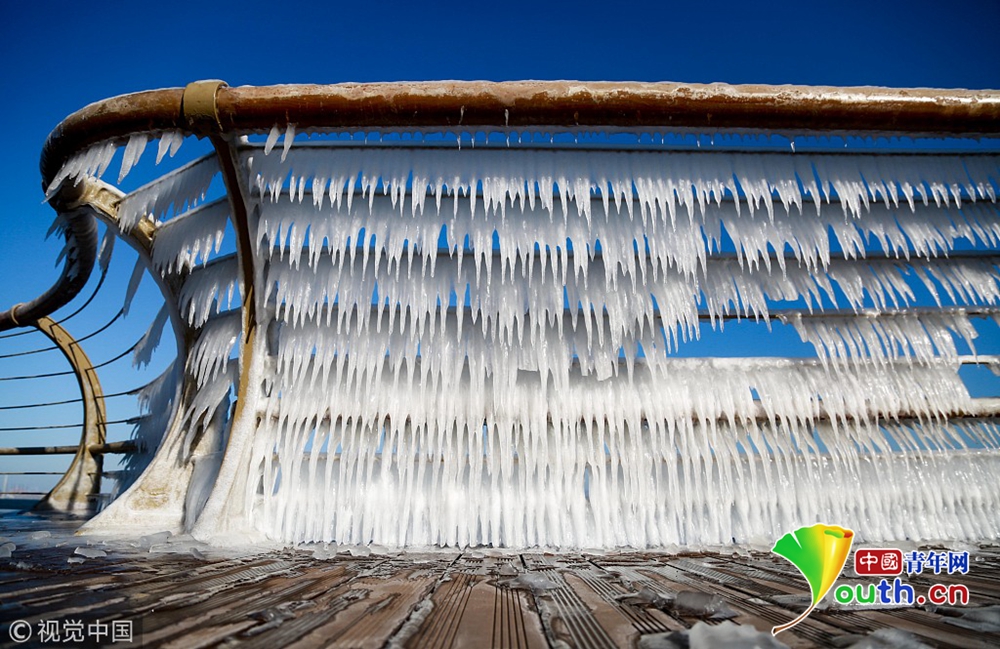 2018年12月29日,大連,晶瑩剔透的冰凌錯(cuò)落有致的懸掛在東港海岸的木棧道護(hù)欄上,美輪美奐,形成了一道“風(fēng)雕冰琢”的風(fēng)景。