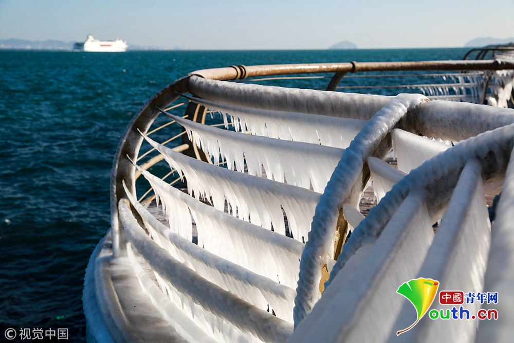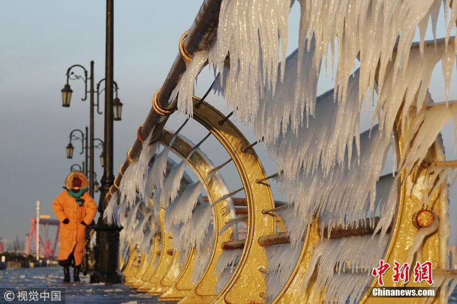 隨著北方持續(xù)低溫,渤海大連海域的海水在潮汐和大風(fēng)的作用下涌上岸邊,在護(hù)欄上凝結(jié)成大面積的冰凌景觀。