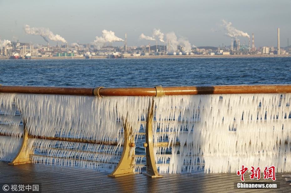 渤海海水在北風的作用下涌向岸邊,在大連東港海岸護欄上凝結成冰凌,形成約有兩公里的冰凌奇觀。圖為大連市東港海岸護欄結滿晶瑩剔透的冰棱。圖片來源:視覺中國
