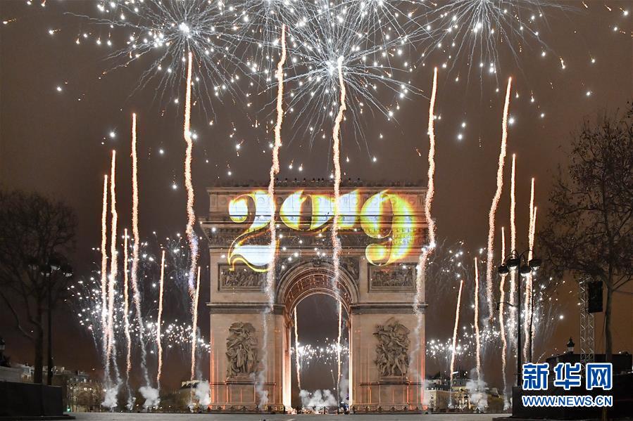 這是1月1日在法國(guó)巴黎凱旋門拍攝的燈光秀和煙火。 法國(guó)巴黎以在凱旋門打上投影燈光和放煙火的方式迎接新年的到來(lái)。 新華社記者陳益宸攝
