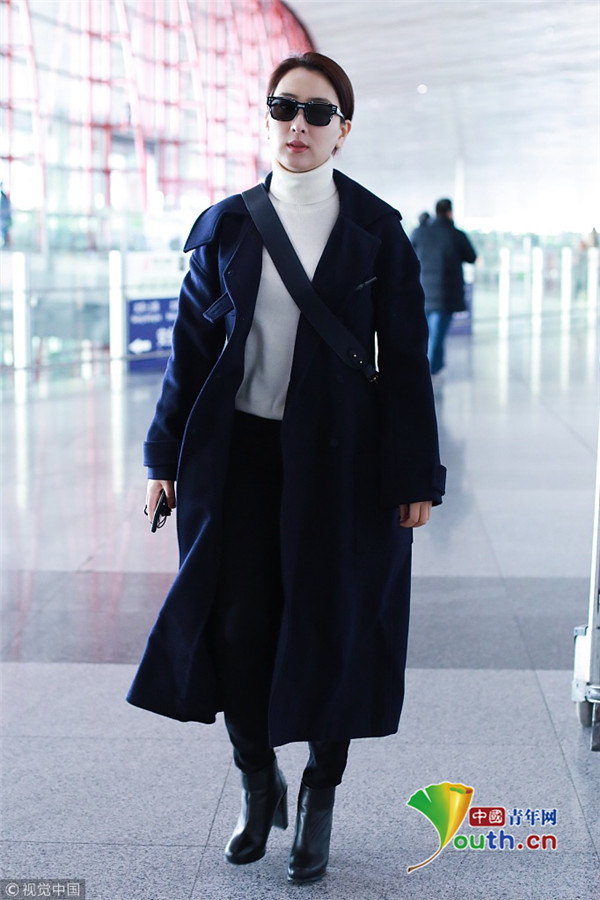 2019年1月7日,北京,馬蘇現(xiàn)身機(jī)場。她身穿黑色到腳大衣霸氣外露,架黑超涂紅唇似帥氣“女特工”。