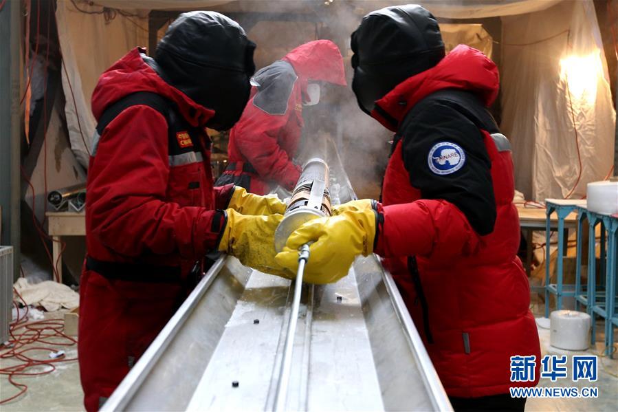 科考隊(duì)員處理鉆取的2.8米長冰芯(1月12日攝)。 新華社記者 劉詩平 攝