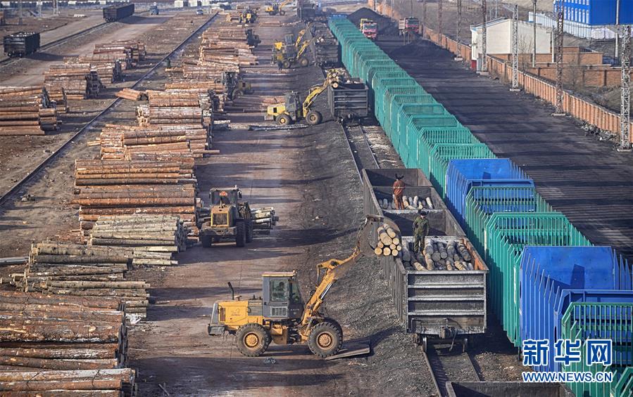 1月12日,在滿洲里鐵路口岸站裝卸二車間原木換裝場區(qū),工作人員進(jìn)行原木裝車作業(yè)。 新華社記者 才揚 攝