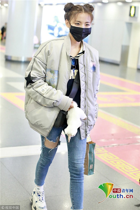 2019年1月14日,北京,楊超越現(xiàn)身機場。她扎哪吒頭活力十足,甩玩偶淘氣回眸,穿破洞褲露美腿,披面包服似自帶鼓風(fēng)機。