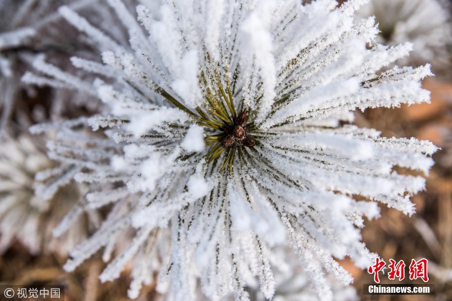 1月13日,107國(guó)道河北省定州路段出現(xiàn)霧凇(樹掛)景觀,吸引路人駐足拍照留念。王保生 攝 圖片來源:視覺中國(guó)