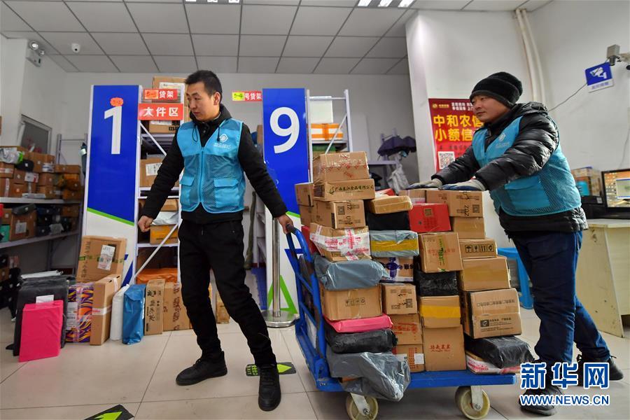 在山西省太原市富士康科技工業(yè)園的一家快遞驛站里,站長(zhǎng)張新(左)在搬運(yùn)快遞(1月15日攝)。