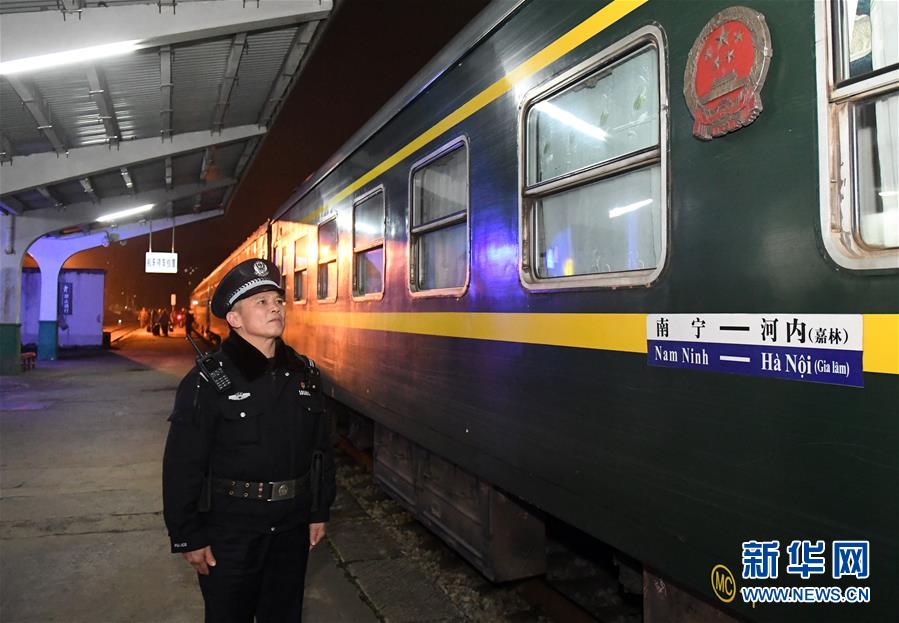 在廣西憑祥火車站,鐵路公安民警陸日峰在一列準(zhǔn)備開往越南的火車旁值勤(2018年12月31日攝)。 新華社記者陸波岸攝