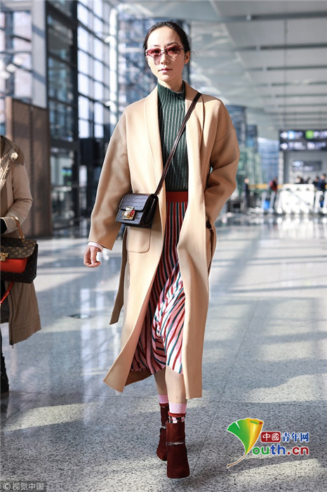 2019年1月17日,上海,韓雪現(xiàn)身機(jī)場(chǎng),穿著條紋紗裙露出小腿,十分抗凍,她搭配經(jīng)典的駝色大衣,氣質(zhì)出眾在機(jī)場(chǎng)人群中相當(dāng)搶鏡。