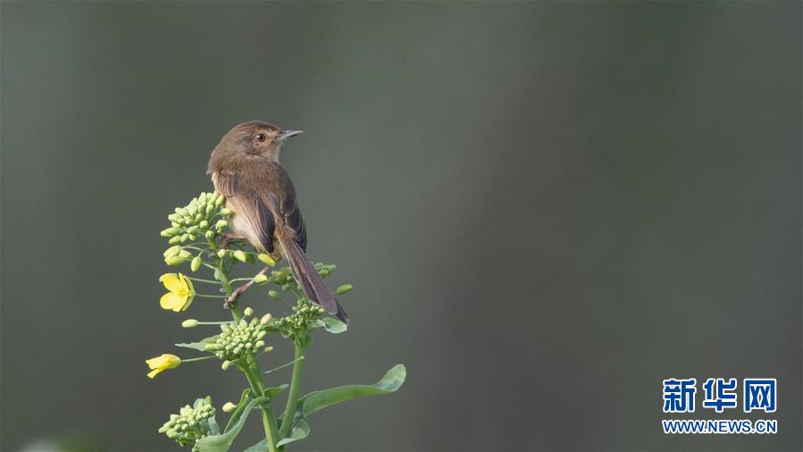 一只小鳥(niǎo)在油菜花枝頭上停歇(2月15日攝)。 新華社記者梅永存攝