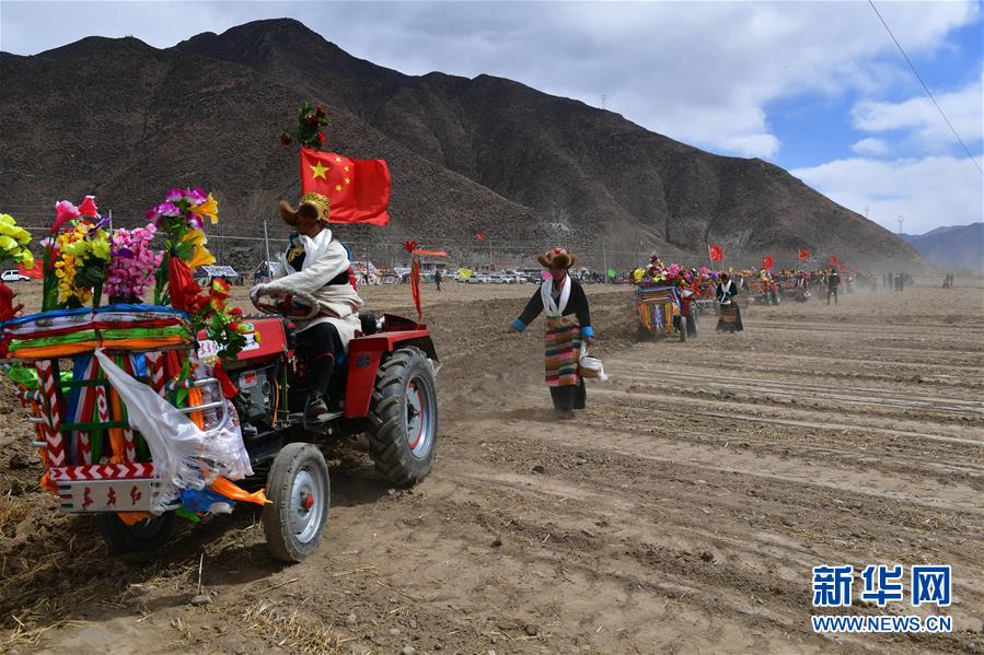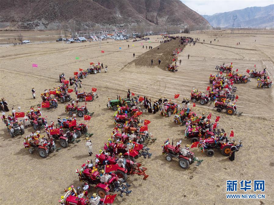 3月16日拍攝的拉薩市達(dá)孜區(qū)唐嘎鄉(xiāng)開(kāi)耕儀式現(xiàn)場(chǎng)。 當(dāng)日,西藏各地男女老幼身著節(jié)日盛裝,駕著一輛輛由彩旗、花朵裝扮一新的拖拉機(jī),涌向待墾的農(nóng)田,載歌載舞迎來(lái)一年一度的開(kāi)耕儀式。 新華社記者 張汝鋒 攝