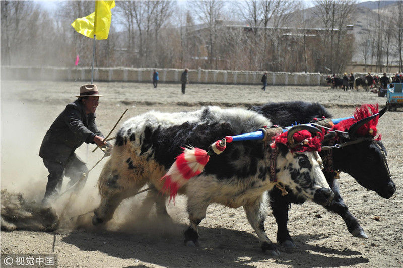 圖為白朗縣洛江鎮(zhèn)農(nóng)牧民進(jìn)行“賽牛”活動(dòng),只要農(nóng)牧民不從犁上掉下來(lái),便可以獲得一把象征著勞動(dòng)致富的鐵鍬。