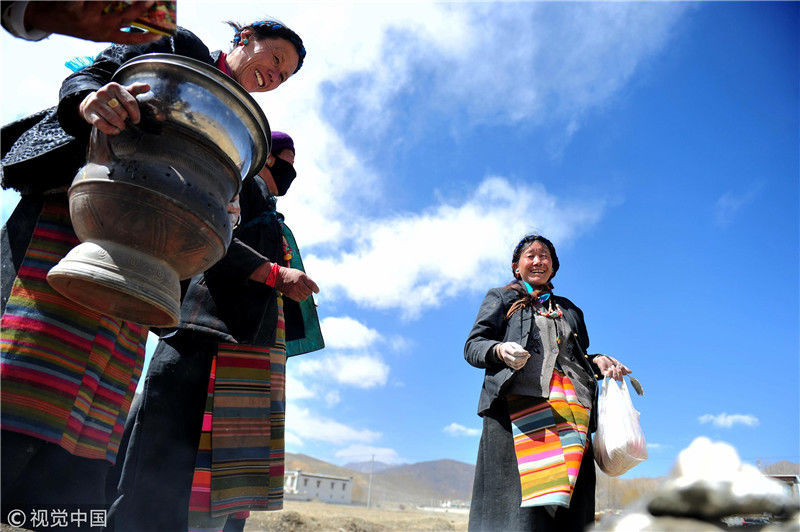 2019年3月16日,西藏各地迎來(lái)開(kāi)耕節(jié)。位于年楚河畔的日喀則白朗縣被譽(yù)為“后藏糧倉(cāng)”,當(dāng)日,當(dāng)?shù)夭刈遛r(nóng)牧民將家里的耕牛裝扮一新,對(duì)農(nóng)田進(jìn)行開(kāi)耕,大家齊聚青稞地,慶祝春播開(kāi)始。圖為白朗縣洛江鎮(zhèn)民眾在青稞地里煨桑煙(一種祈福方式)、敬獻(xiàn)青稞酒,祈福新的一年風(fēng)調(diào)雨順、五谷豐登。 江飛波(西藏分社)/中新社/視覺(jué)中國(guó) 編輯/陳進(jìn)