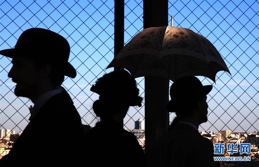 3月30日,在法國巴黎,音樂劇《300米高塔》的演員身著19世紀服裝站在埃菲爾鐵塔一層平臺上。于1889年3月31日正式落成的法國巴黎埃菲爾鐵塔迎來130歲生日。從30日起,包括演出、冒險游戲、圖片展在內(nèi)的多項活動在埃菲爾鐵塔舉行,為這座宏偉建筑慶生。新華社記者 高靜 攝
