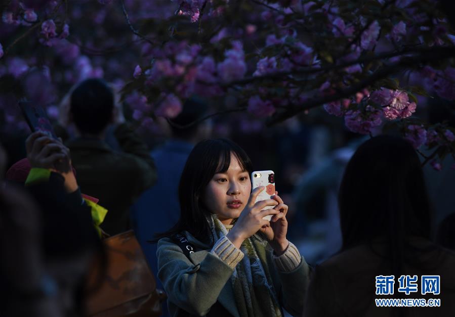 3月31日,游客在中國(guó)科學(xué)技術(shù)大學(xué)東區(qū)為櫻花樹(shù)下的同伴拍照。
