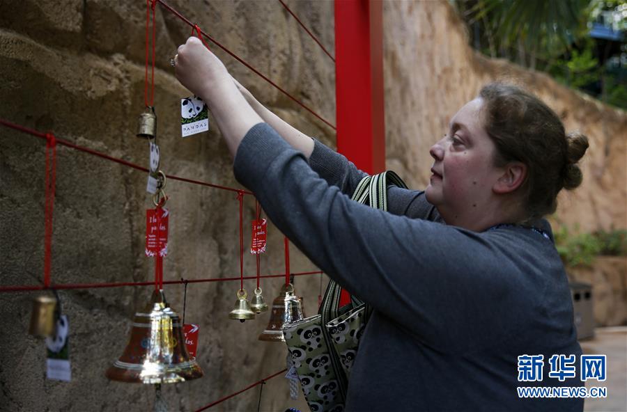 4月6日,在美國圣迭戈動(dòng)物園,一名游客在“大熊貓友誼墻”上掛上祝福簽。新華社記者李穎攝