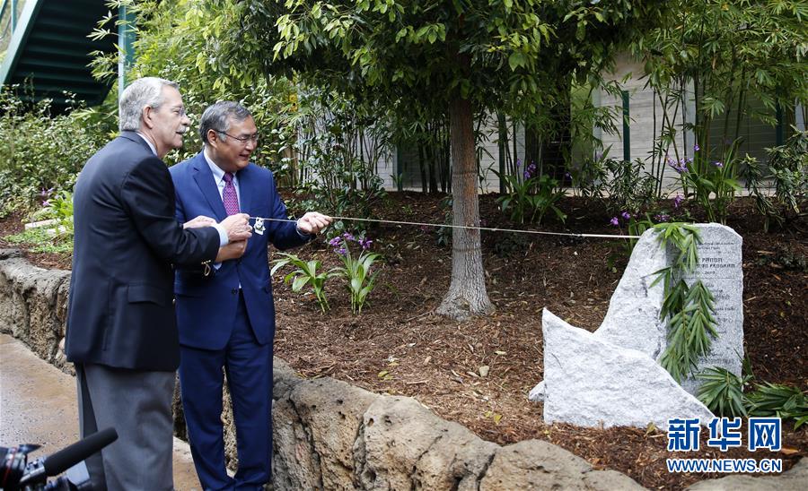 4月6日,在美國圣迭戈動(dòng)物園,中國駐洛杉磯總領(lǐng)事張平(右)為“大熊貓保護(hù)項(xiàng)目”紀(jì)念碑揭幕。新華社記者李穎攝