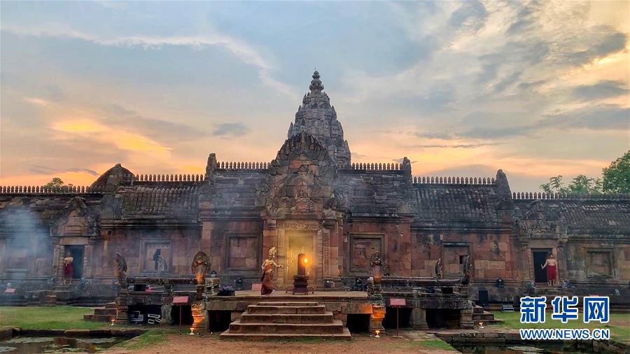 4月5日,在泰國武里南府,當?shù)嘏源虬绯上膳臉幼釉谂羶z隆寺前跳舞。 一年一度的“登帕儂隆山節(jié)”在泰國東北部毗鄰柬埔寨的武里南府帕儂隆山舉辦。當?shù)厝艘怨叛b巡游展示獨特的傳統(tǒng)文化,希望能吸引更多外國游客、促進當?shù)芈糜螛I(yè)發(fā)展。 新華社記者 楊舟 攝