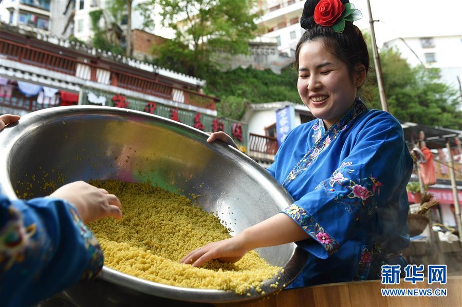 4月17日,在貴州省臺(tái)江縣姊妹街哆蝶五彩姊妹飯?bào)w驗(yàn)店,苗家婦女在蒸煮五彩“姊妹飯”。新華社記者 楊文斌 攝
