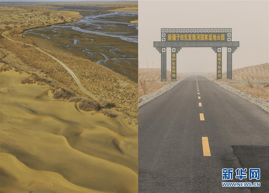 拼版照片:左圖為沿著克里雅河通向地處沙漠深處新疆于田縣達里雅布依鄉(xiāng)的路(3月19日無人機拍攝);右圖為從縣城通往達里雅布依小鎮(zhèn)易地扶貧安置點的柏油路(3月20日攝)。新華社記者 胡虎虎 攝