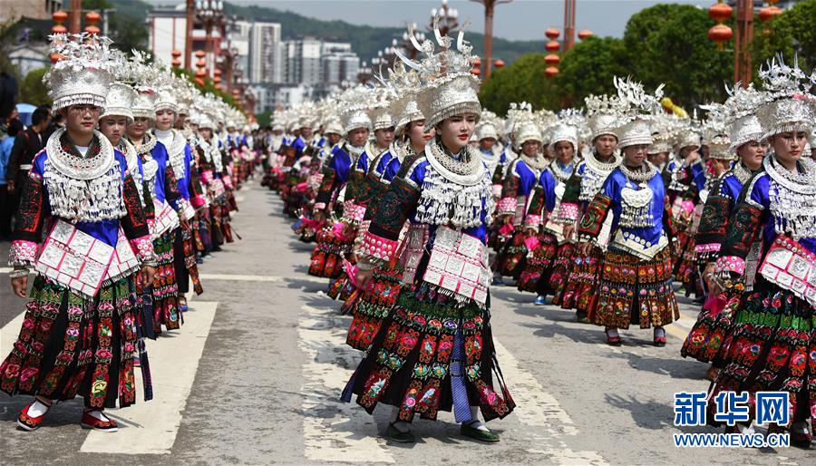 4月18日,臺江縣苗族群眾參加盛裝游演活動。 當日,貴州省黔東南苗族侗族自治州臺江縣迎來一年一度的苗族姊妹節(jié)。節(jié)日期間將舉行苗族盛裝游演、千人長桌宴、千人游方體驗、苗族手工創(chuàng)意大賽等一系列活動。 姊妹節(jié)是臺江縣苗族同胞的傳統(tǒng)節(jié)日,2006年被列入第一批國家級非物質文化遺產名錄。 新華社記者 楊文斌 攝