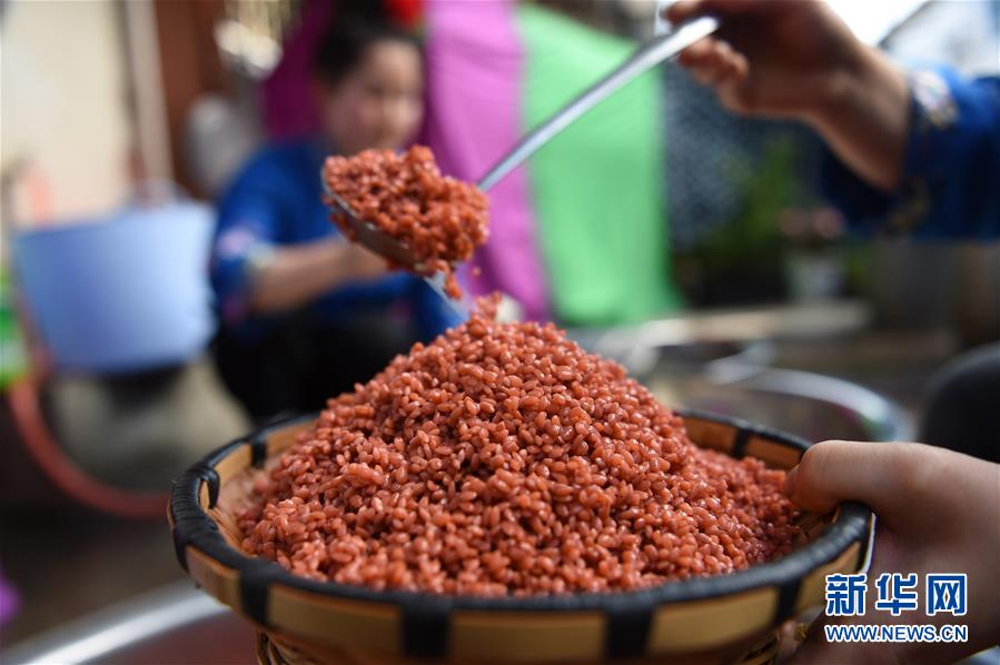 4月17日,在貴州省臺江縣姊妹街哆蝶五彩姊妹飯體驗店,苗家婦女在攤晾五彩“姊妹飯”。 新華社記者 楊文斌 攝