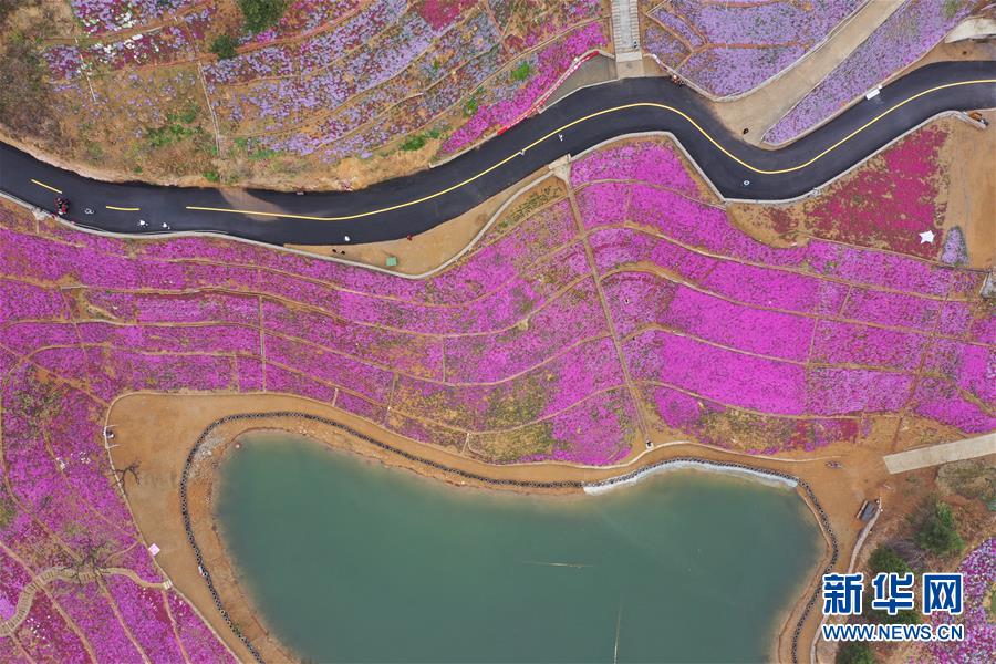 4月24日無人機拍攝的雨花谷景區(qū)。近日,河北省遷西縣雨花谷景區(qū)的芝櫻花盛開,吸引游客前來觀賞。 新華社記者 楊世堯 攝
