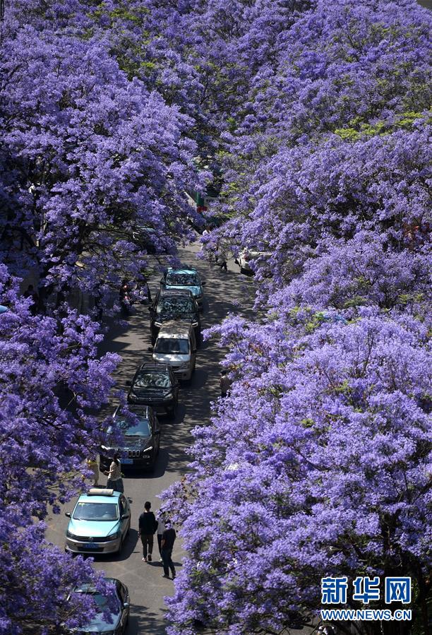 昆明市教場中路一帶的藍花楹進入盛花期(4月24日攝)。近日,云南昆明市不少街區(qū)的藍花楹相繼開放,為美麗春城增添了一處處風景。 新華社記者秦晴攝