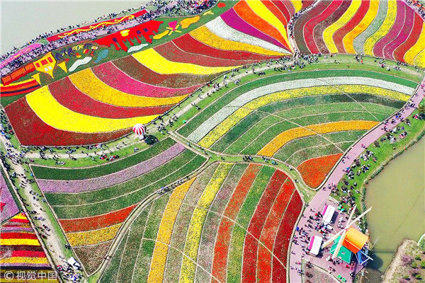 2019年4月6日,江蘇鹽城市大豐荷蘭花海的300萬株郁金香隨風盛開,吸引了眾多市民和游客前來觀賞。從空中看,一片片彩色的郁金香花田仿佛巨幅彩帶,將數百畝花海裝扮得分外美麗。楊素平/視覺中國