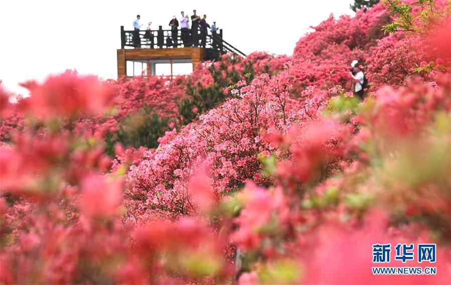 4月25日,游客在龜峰山杜鵑花海中游玩。 近日,湖北省麻城市龜峰山的10萬畝古杜鵑盛開,大量游客前來賞花觀景。 新華社記者 程敏 攝