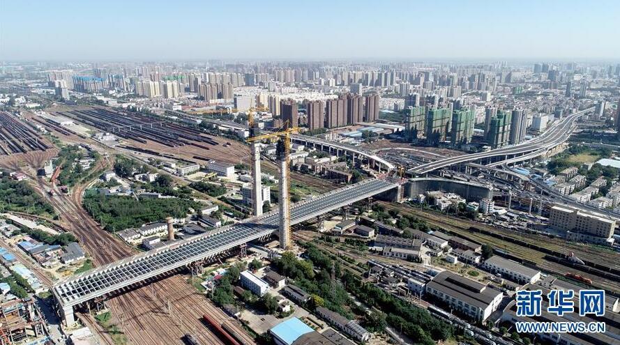 9月7日無(wú)人機(jī)拍攝的鄭北大橋鋼梁頂推施工現(xiàn)場(chǎng)。當(dāng)日,跨越鄭州北站的鄭北大橋鋼梁頂推成功。鄭北大橋是東西走向的鄭州市農(nóng)業(yè)路快速通道工程的一部分,需跨越鄭州北站。由于列車(chē)不能中斷運(yùn)行,鄭北大橋不能采用常見(jiàn)的搭腳手架方式施工,而是采用頂推法,即在大橋一端把橋身拼接好,然后一段一段朝著鐵路編組站上方送過(guò)去,最終完成橋梁架設(shè)。新華社記者朱祥攝