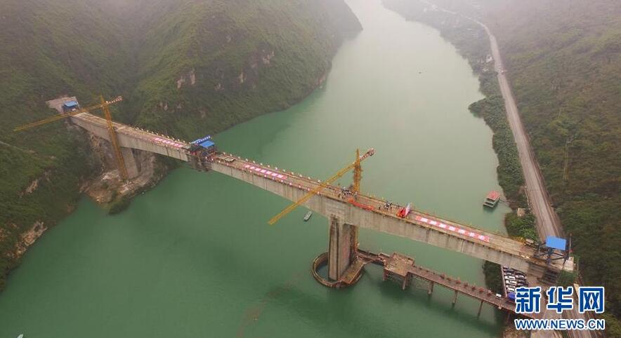 在重慶涪陵拍攝的渝懷鐵路涪秀二線重點(diǎn)工程——烏江右線大橋(10月23日無(wú)人機(jī)拍攝)。10月23日,由中鐵四局承建的渝懷鐵路涪秀二線重點(diǎn)工程——烏江右線大橋主跨成功合龍,標(biāo)志著大橋主體工程全部順利結(jié)束。烏江右線大橋項(xiàng)目全程460.1米,主跨192米,跨越烏江和319國(guó)道。在兩年多的建設(shè)過(guò)程中,施工人員攻克了“不等高墩”“不對(duì)稱(chēng)邊跨”“邊跨入隧”等多個(gè)技術(shù)難題。新華社記者王全超攝