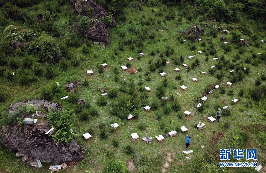 5月10日,在甘肅省隴南市徽縣大河店鎮(zhèn)硬灣村,蜂農(nóng)查看蜂箱情況(無(wú)人機(jī)拍攝)。 甘肅省隴南市徽縣大河店鎮(zhèn)硬灣村位于秦巴山區(qū)深處,2017年,在當(dāng)?shù)卣姆龀窒?,龍崖老巢蜜養(yǎng)殖農(nóng)民專(zhuān)業(yè)合作社成立,蜂農(nóng)們將傳統(tǒng)養(yǎng)蜂技藝和現(xiàn)代加工方式相結(jié)合,并通過(guò)電商等渠道打開(kāi)銷(xiāo)路,有效帶動(dòng)了當(dāng)?shù)刎毨Т迕衩撠氈赂弧D壳罢麄€(gè)合作社共有蜂箱2000余個(gè),每箱每年可帶來(lái)三四千元的收入。 新華社記者 馬寧 攝