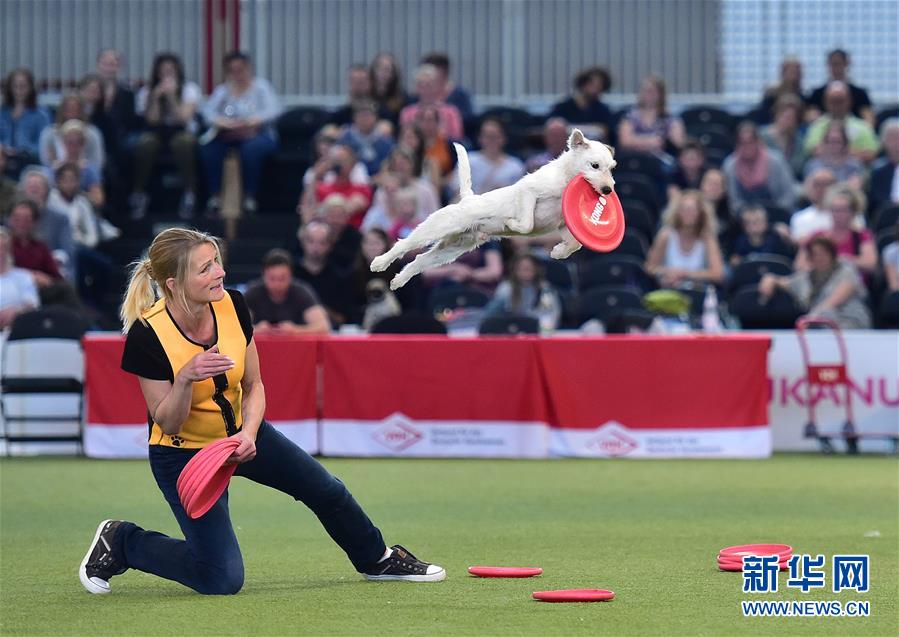 5月19日,在德國(guó)多特蒙德舉行的寵物展上,訓(xùn)犬師沃爾夫帶著愛(ài)犬進(jìn)行“狗接飛盤”表演。 為期三天的德國(guó)多特蒙德“狗和貓”寵物展19日落幕。寵物展期間,人們帶著自己的“萌寵”來(lái)到會(huì)場(chǎng),參與寵物跳水、舞蹈、選美等趣味比賽,并與其他寵物愛(ài)好者及展商交流互動(dòng)。 新華社記者逯陽(yáng)攝