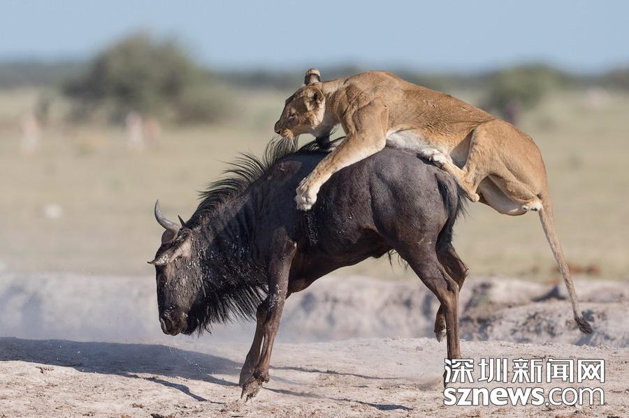 英國攝影師蘇-莫里斯(Sue Morri)在博茨瓦納Nxai Pan國家公園游玩,目睹了一場兇惡母獅獵食角馬的畫面。母獅甚至攀到了角馬背上,想要牢牢遏制住到手的“美餐”。強壯的角馬努力地與母獅抗?fàn)?,竭力想要保住自己的性命,但最終還是不敵母獅被拿下,最后成了母獅孩子們的盤中餐。