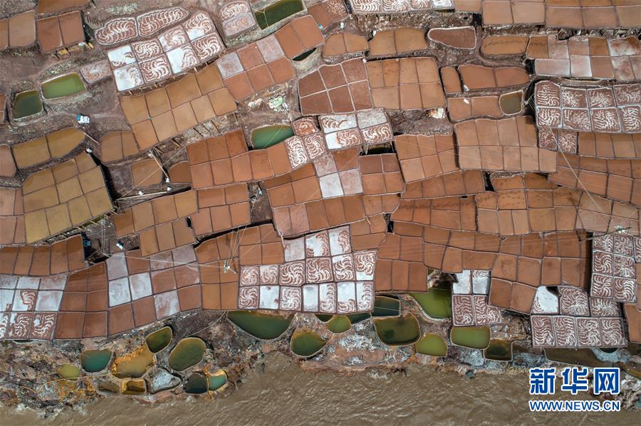 這是西藏芒康縣納西民族鄉(xiāng)的古鹽田景觀(5月22日無人機拍攝)。位于西藏昌都芒康縣瀾滄江畔的古鹽田,至今仍保持最原始的手工曬鹽方式。據(jù)史料記載,唐朝時期當(dāng)?shù)鼐烷_始曬鹽。鹽田在瀾滄江兩岸依山而建,由多根木柱搭架,架上用透水性強的泥土鋪成平面夯實,當(dāng)?shù)鼐用駨臑憸娼系柠}井、鹽池中取出鹵水倒入鹽田,經(jīng)陽光蒸曬、風(fēng)干,結(jié)晶成鹽。遠遠望去,鹽田錯落有致,田中鹵水宛若鏡面,形成壯麗奇觀。新華社記者李鑫 攝