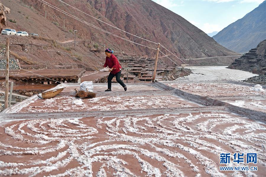 5月22日,西藏納西民族鄉(xiāng)加達(dá)村村民拉措在鹽田上收鹽。位于西藏昌都芒康縣瀾滄江畔的古鹽田,至今仍保持最原始的手工曬鹽方式。據(jù)史料記載,唐朝時(shí)期當(dāng)?shù)鼐烷_(kāi)始曬鹽。鹽田在瀾滄江兩岸依山而建,由多根木柱搭架,架上用透水性強(qiáng)的泥土鋪成平面夯實(shí),當(dāng)?shù)鼐用駨臑憸娼系柠}井、鹽池中取出鹵水倒入鹽田,經(jīng)陽(yáng)光蒸曬、風(fēng)干,結(jié)晶成鹽。遠(yuǎn)遠(yuǎn)望去,鹽田錯(cuò)落有致,田中鹵水宛若鏡面,形成壯麗奇觀。新華社記者李鑫 攝