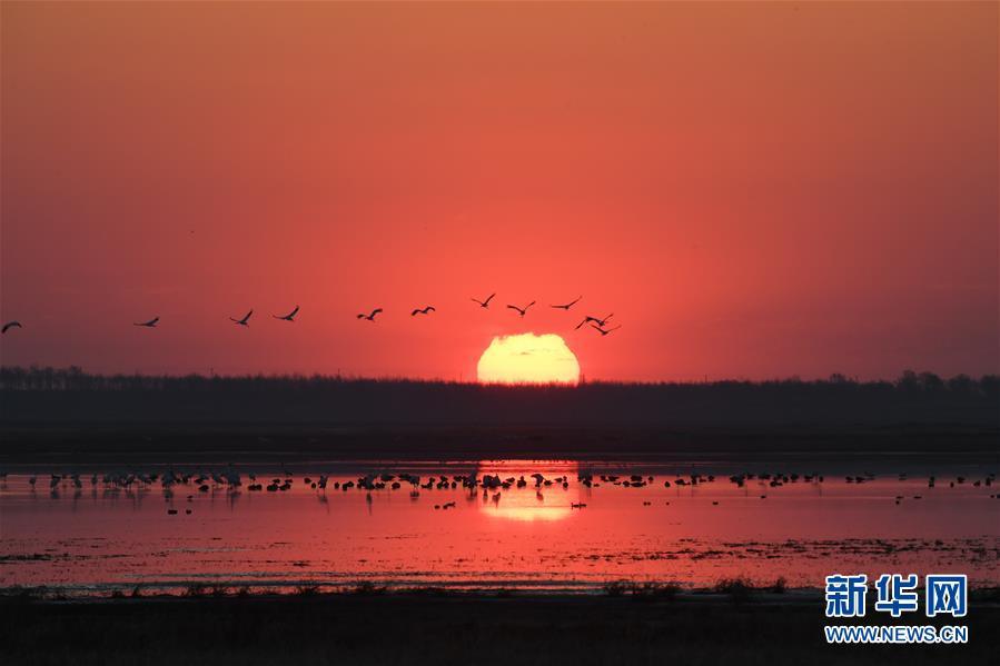 在吉林莫莫格國家級(jí)自然保護(hù)區(qū),一群白鶴從濕地上空飛過(4月11日攝)。 新華社記者 張楠 攝