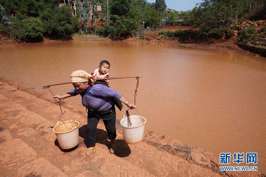 5月17日,巡檢司鎮(zhèn)烏稠村村民楊永珍從附近的壩塘挑水。 云南省紅河哈尼族彝族自治州彌勒市大部分地區(qū)氣象干旱等級(jí)近期已達(dá)中旱,其中山區(qū)和半山區(qū)達(dá)到重旱,18.8萬畝農(nóng)作物受旱,2700余人、960多頭牲畜飲水困難。當(dāng)?shù)匾呀M織4.2萬人、1萬臺(tái)車輛投入抗旱工作。 新華社記者 秦晴 攝