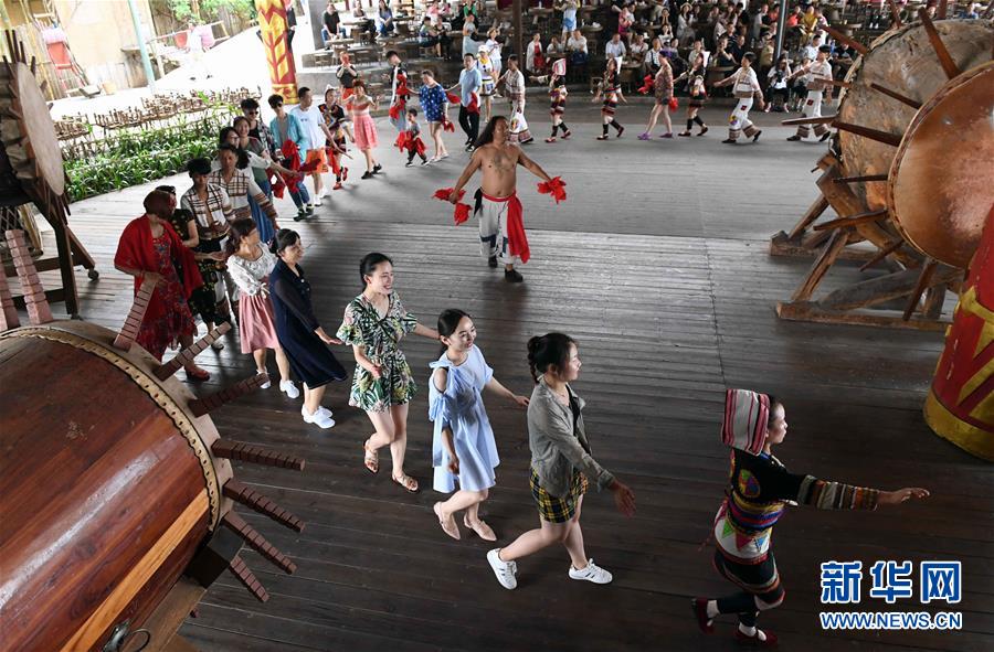 游客與基諾族大鼓舞演員一起跳舞(6月1日攝)。 在云南省西雙版納傣族自治州景洪市基諾山基諾族鄉(xiāng)的基諾族村寨,每天的基諾大鼓舞表演吸引了眾多游客前來觀賞體驗,帶動了基諾族群眾就業(yè)和增收。基諾族大鼓舞蘊涵豐富的歷史文化內涵,已被列入國家級非物質文化遺產保護名錄。 新華社記者 楊宗友 攝