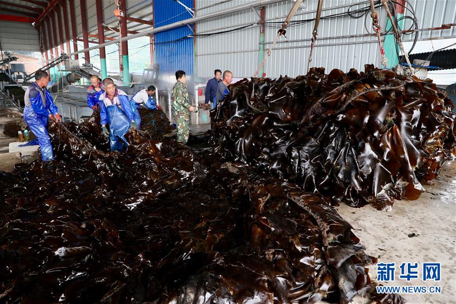 6月5日,在榮成市尋山街道青魚(yú)灘村,漁民在加工剛收獲的海帶。 近日,山東省榮成市迎來(lái)海帶收獲季。據(jù)悉,榮成市海帶養(yǎng)殖面積14.5萬(wàn)畝,年產(chǎn)海帶43.3萬(wàn)噸以上。 新華社記者郭緒雷攝