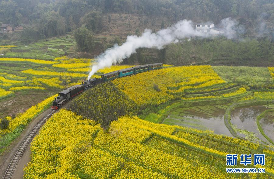 3月20日,一列嘉陽(yáng)小火車在油菜花叢中穿行(無(wú)人機(jī)拍攝)。