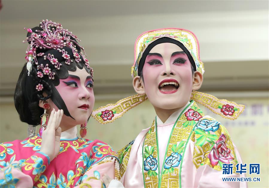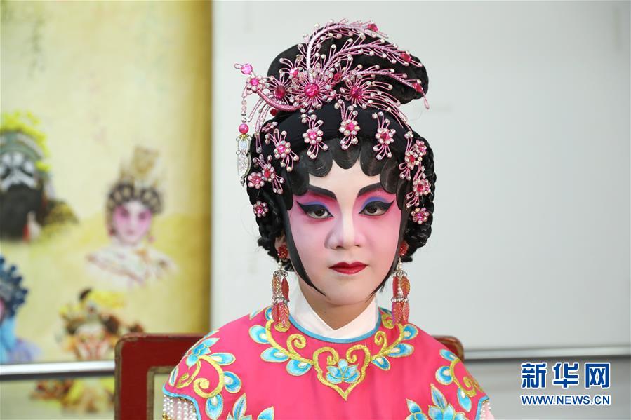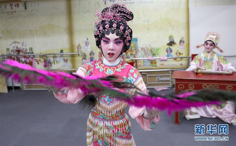 粵劇小演員陸瑞徽在準備折子戲《艷曲醉周郎》的表演(6月8日攝)。 聲輝粵劇推廣協(xié)會成立于2003年,是香港重要粵劇藝術團體之一,致力于向青少年推廣粵劇。協(xié)會目前有兩個初班,3個中班,一個青少年班?;泟∮址Q“廣東大戲”,表演技藝包括“唱做念打”,即唱功、身段、臺詞、武打,主要流行于廣東、廣西和香港、澳門等地區(qū)。2009年,粵劇被列入聯(lián)合國教科文組織人類非物質文化遺產(chǎn)代表作名錄,今年正逢十周年。 新華社記者 吳曉初 攝