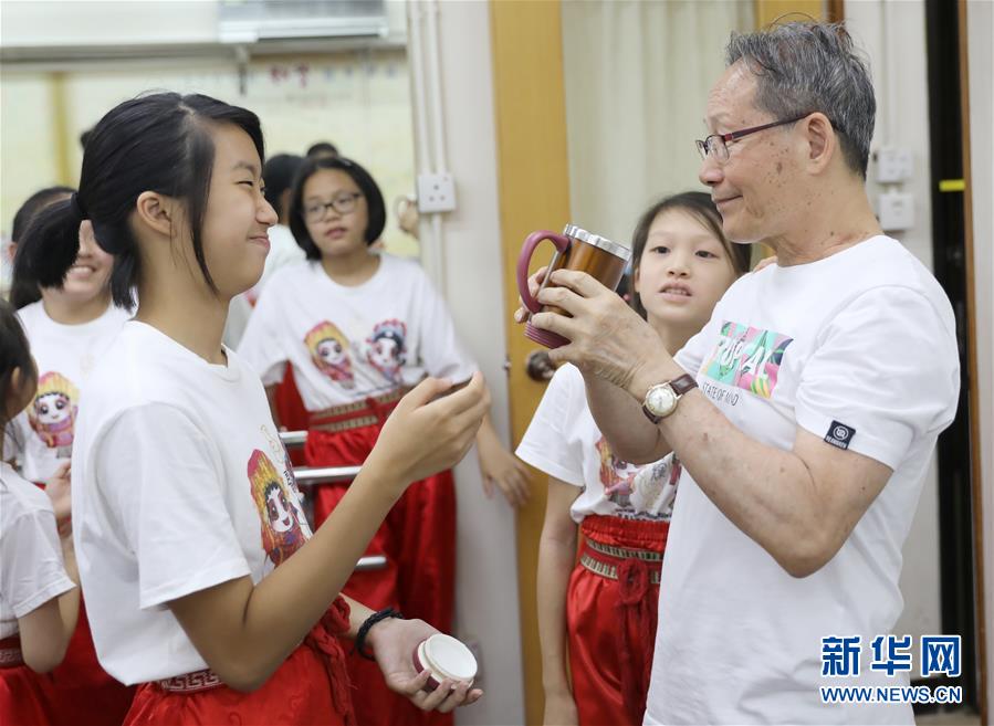 一群孩子和79歲的粵劇名伶楊劍華在一起(6月8日攝)。 聲輝粵劇推廣協(xié)會成立于2003年,是香港重要粵劇藝術團體之一,致力于向青少年推廣粵劇。協(xié)會目前有兩個初班,3個中班,一個青少年班。粵劇又稱“廣東大戲”,表演技藝包括“唱做念打”,即唱功、身段、臺詞、武打,主要流行于廣東、廣西和香港、澳門等地區(qū)。2009年,粵劇被列入聯(lián)合國教科文組織人類非物質文化遺產(chǎn)代表作名錄,今年正逢十周年。 新華社記者 吳曉初 攝
