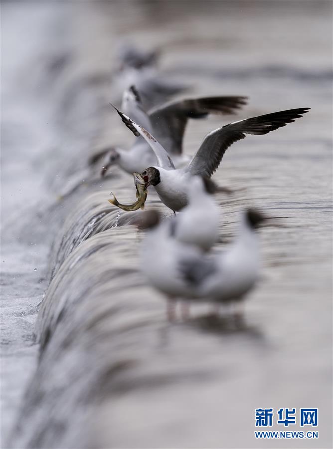 7月6日,在青海省剛察縣沙柳河里,幾只棕頭鷗等待捕捉躍起的湟魚。 新華社記者 費(fèi)茂華攝