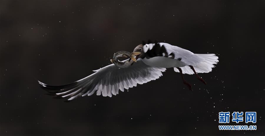 7月6日,在青海省剛察縣沙柳河里,一只棕頭鷗捕捉到一只躍起的湟魚。 新華社記者 吳剛攝