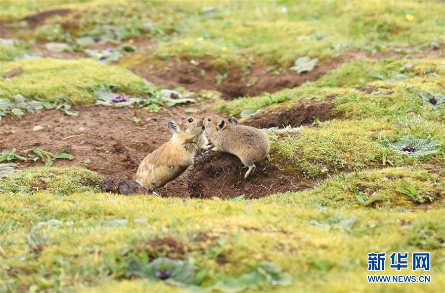 7月6日,兩只高原鼠兔在西藏思金拉錯湖邊嬉戲。  新華社記者 周錦帥 攝