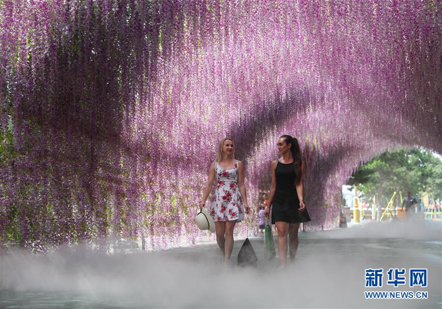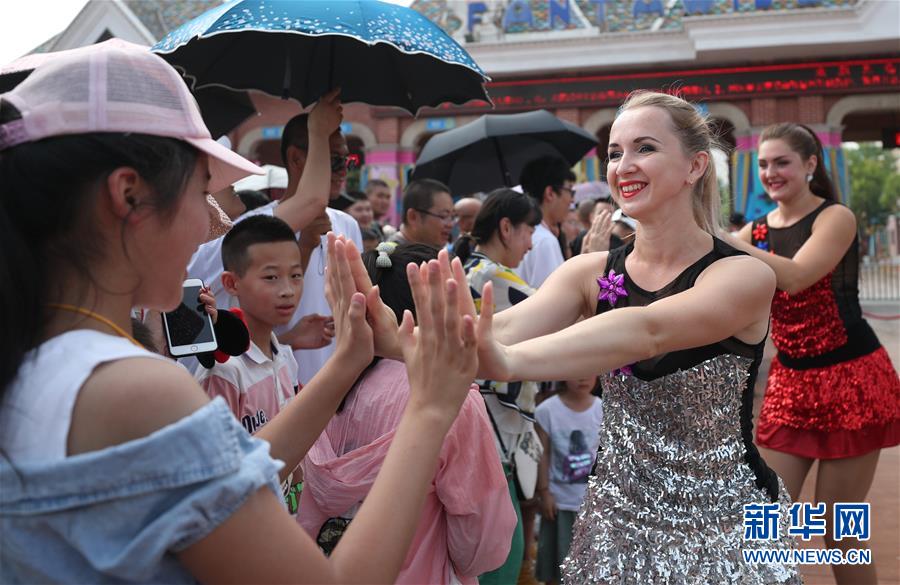 7月31日,列娜(前排左)在沈陽(yáng)方特歡樂(lè)世界門前表演舞蹈。