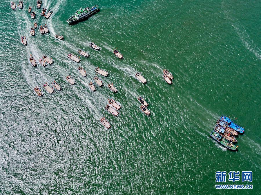 8月3日,首屆福清開漁節(jié)增殖放流活動上人們在向大海投放魚苗(無人機拍攝)。