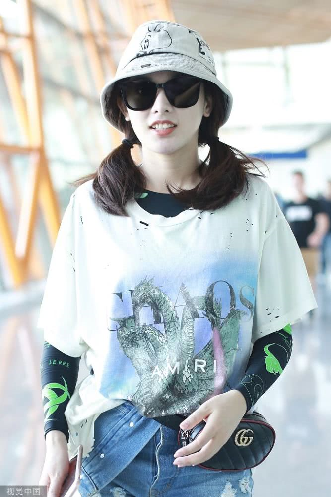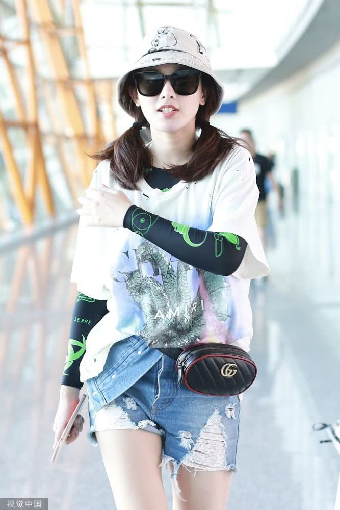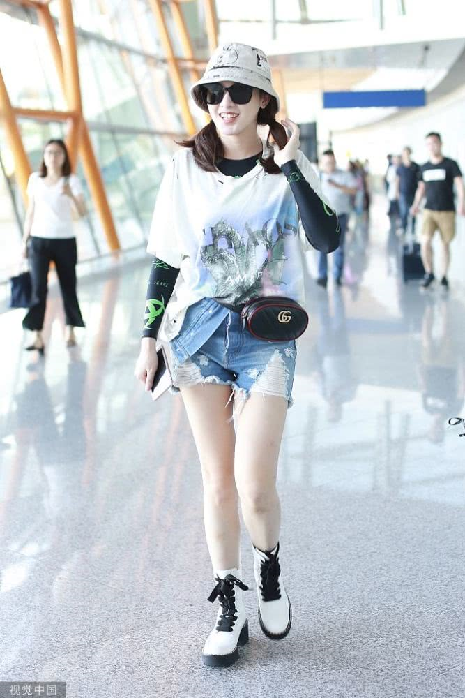內地女星彭小苒現(xiàn)身機場,穿印花T恤牛仔短褲,白色馬丁靴很時髦