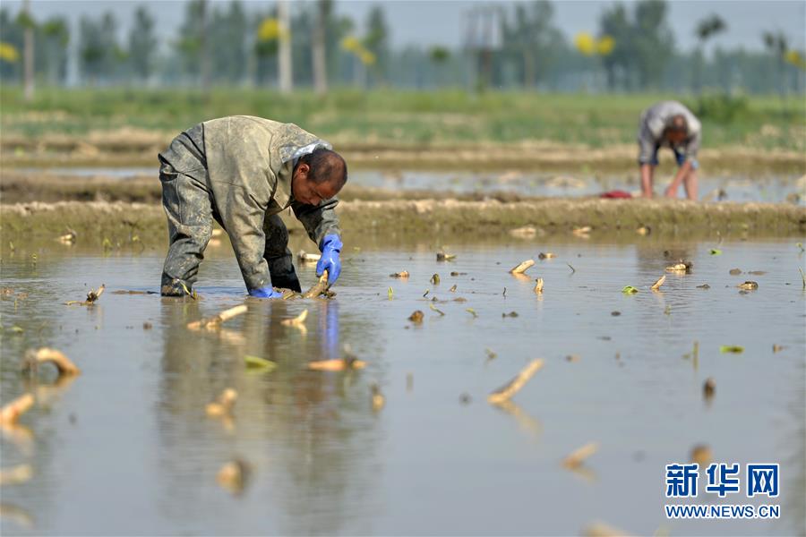5月14日,河北省隆堯縣東良鎮(zhèn)澤畔村的農(nóng)民在種植蓮藕。新華社記者牟宇攝